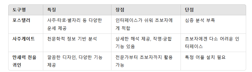 ✔ 초보자는 '포스텔러' 같은 간단한 앱을 이용하는 것이 좋고, 심층 분석이 필요하다면 '사주게이트' 같은 전문적인 사이트를 활용하는 게 좋아요.
