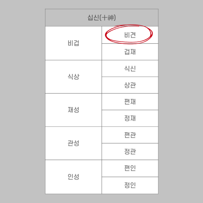사주에는 십신(十神)이라는 개념이 있어요. 십신은 내가 태어난 날의 기운(일간)과 나머지 천간과의 관계를 분석하는 개념인데요. 비견은 십신 중 하나이며, 십신에는 다음과 같은 요소들이 포함돼요.